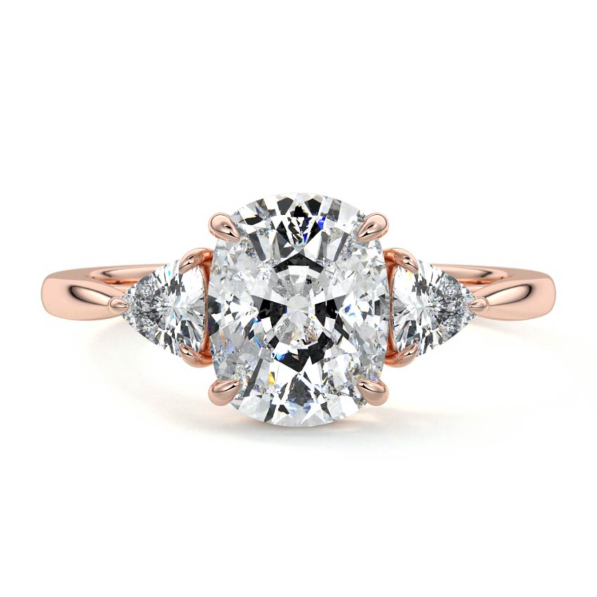 This exquisite three stone engagement ring showcases a brilliant oval cut lab grown diamond, elegantly flanked by two dazzling trillion side stones. Set on a polished rose gold band, this design radiates timeless sophistication and captivating sparkle, perfect for a cherished proposal.