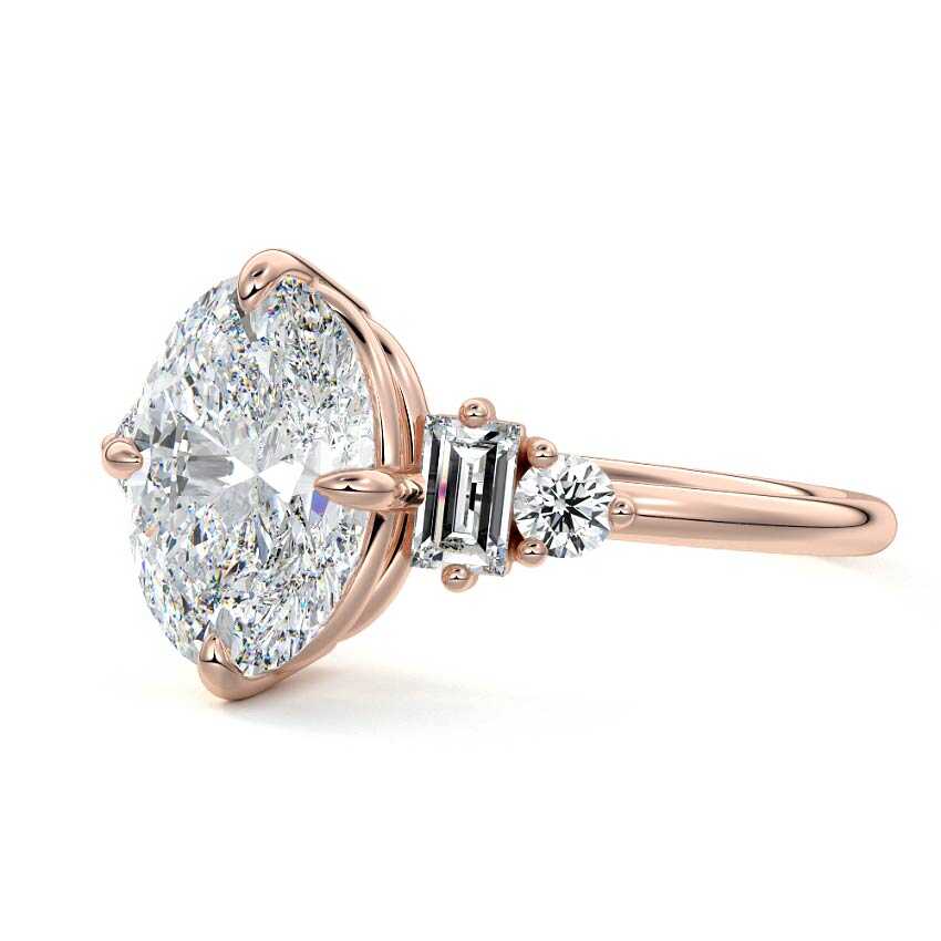 This exquisite three stone engagement ring features a stunning oval cut lab grown diamond at its heart. Flanked by a sophisticated baguette and a brilliant round side stone, this design offers a captivating blend of classic and modern elegance.