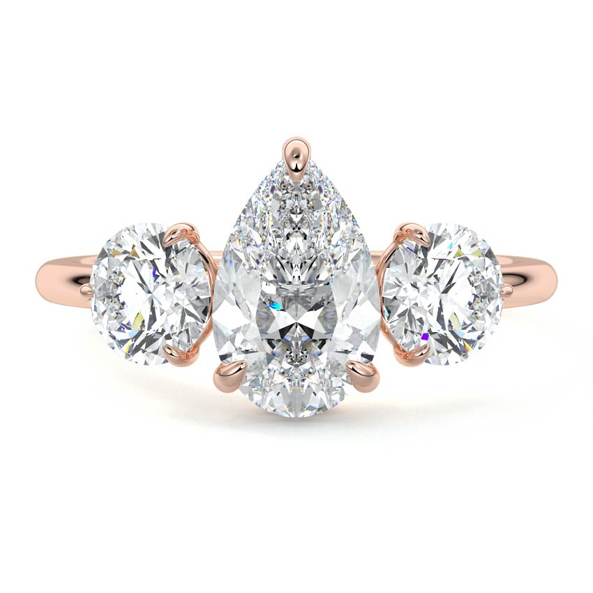 This exquisite three-stone engagement ring showcases a captivating Pear cut lab-grown diamond at its heart. Flanked by two brilliant companion stones, its elegant design symbolizes a journey of enduring love. Crafted to sparkle with unparalleled brilliance, it's a true testament to sophisticated style.