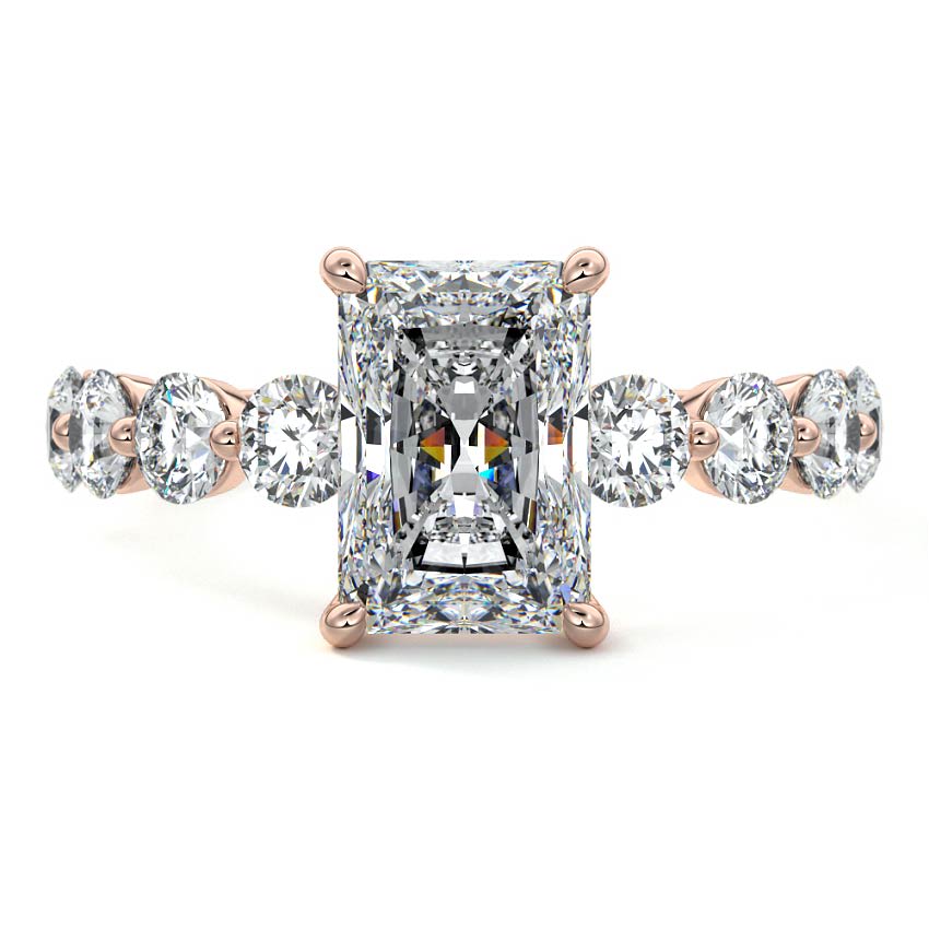 This exquisite three-stone engagement ring features a dazzling Radiant cut lab grown diamond at its center, flanked by two brilliant round diamonds. Additional sparkling sidestones adorn the band, creating a magnificent display of light and luxury.
