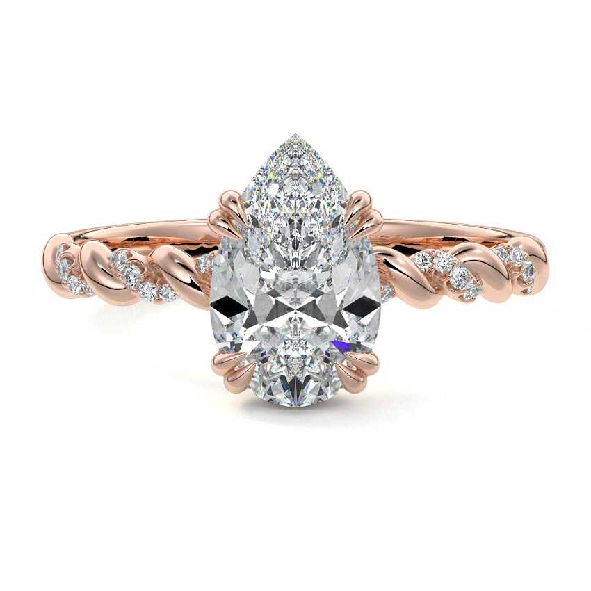 This exquisite engagement ring showcases a captivating pear-shaped lab grown diamond, artfully set atop a beautifully twisted band. Adorned with delicate sidestones, its unique design embodies modern romance and timeless allure.