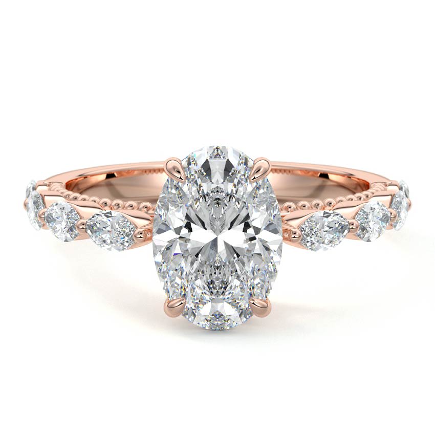 This exquisite vintage-inspired engagement ring features a stunning oval cut lab grown diamond as its captivating centerpiece. Adorned with delicate milgrain detailing and sparkling accent diamonds along the band, it beautifully blends classic charm with modern brilliance, promising a lifetime of elegance.